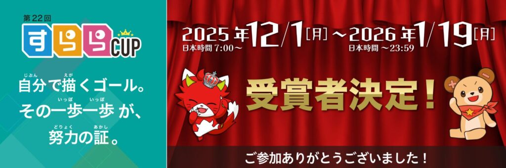 たとえば、4月1日~4月30日の間にすららに入会したら、翌々月の月末の6月30日までに上記のチャレンジをクリアすれば賞品GET!ということです。
