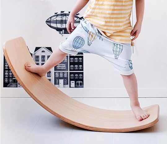 バランスボードは、子どもがその上に立って体のバランスをとるおもちゃです。ゆらゆら揺れたり、ちょっと傾いたりするたびに、自然と全身の筋肉を使うので、すごく良い運動になります。