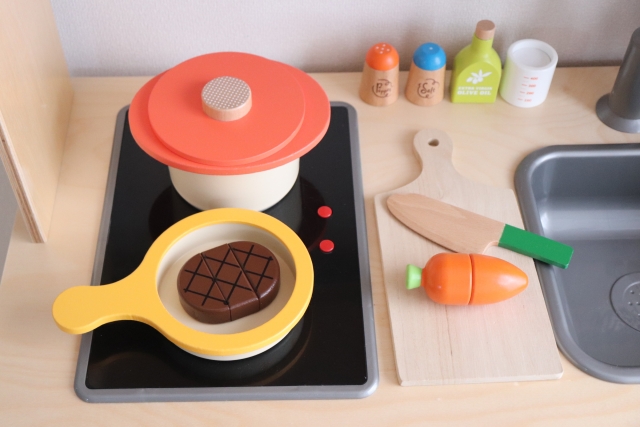 また、包丁で野菜を「トントン」と切る、食べ物をお皿に「コトン」と置くといった動作を通して、手先の巧緻性(微細運動)も鍛えられます。さらに、ストーリーを考えてごっこを展開することで、想像力・順序立てて考える力も育ちます。