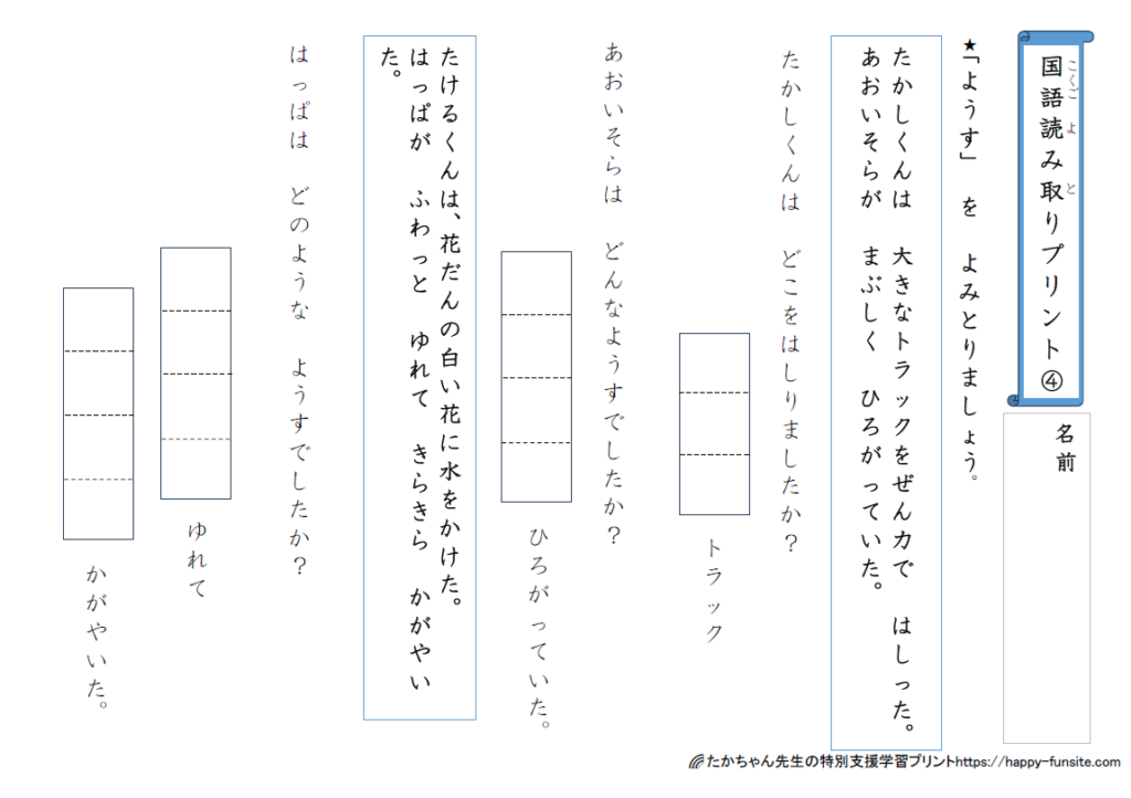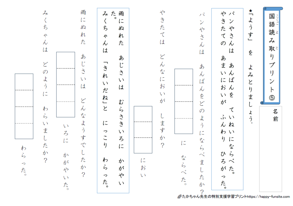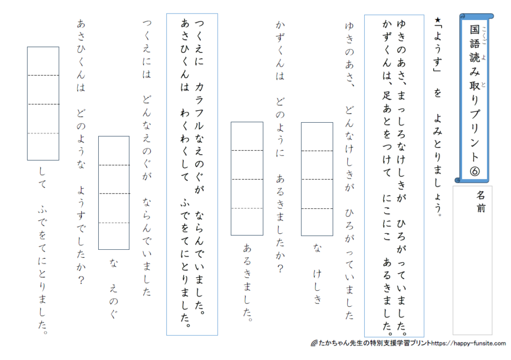 スモールステップで課題を設定しているため、まだ読んでいない方は、国語の読み取りプリント「ようすを読みとる」をお子様の実態に合わせてご利用ください。