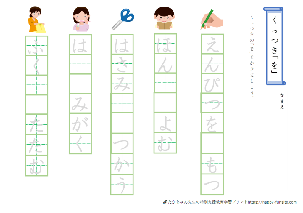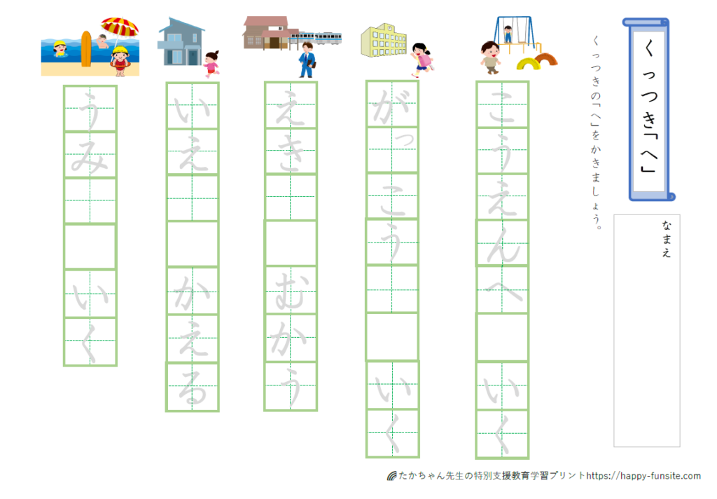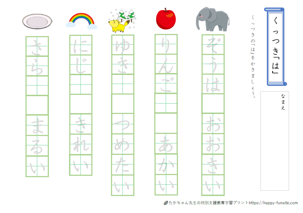 スモールステップで課題を提供しているので、まだ読んでいない方は「助詞のプリント イラスト付き特別支援教材」の、プリントを確認してみてください。