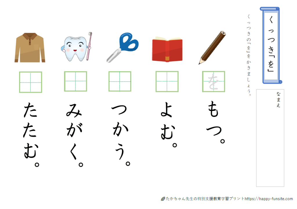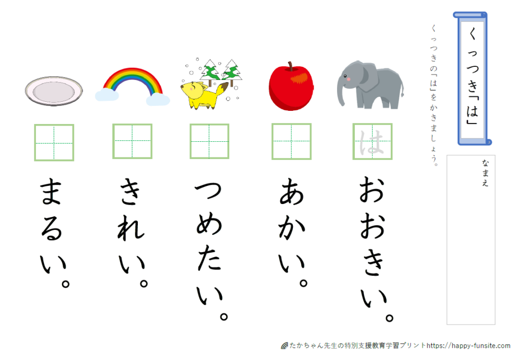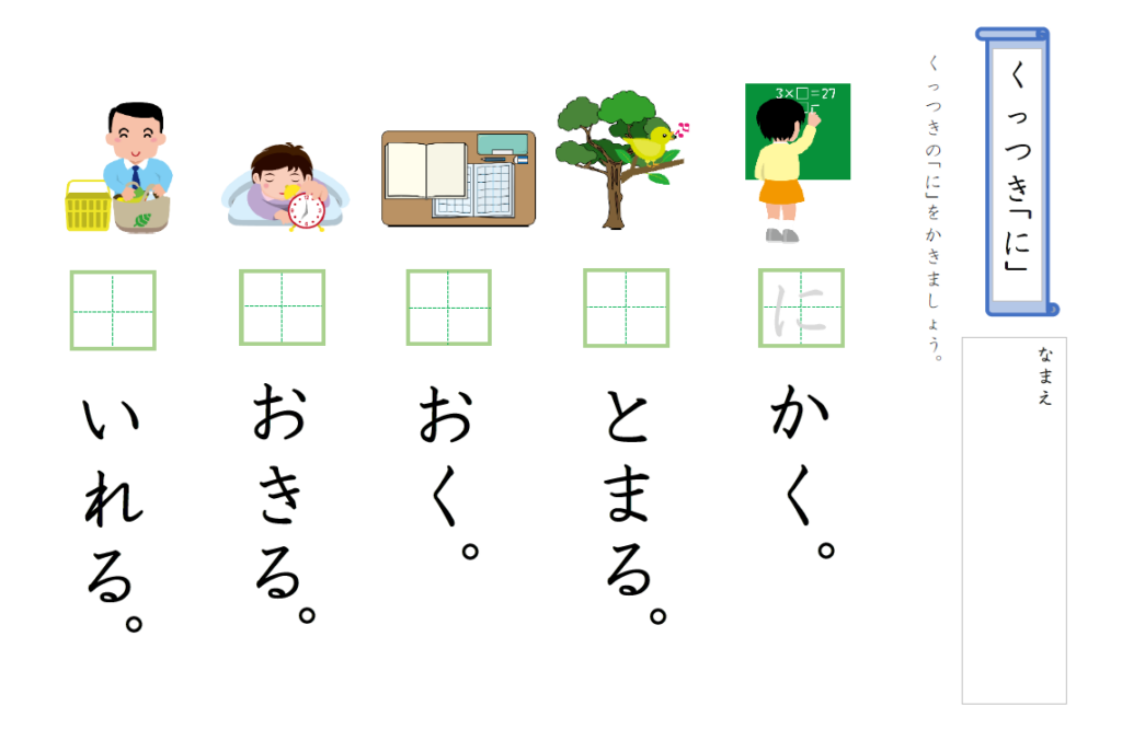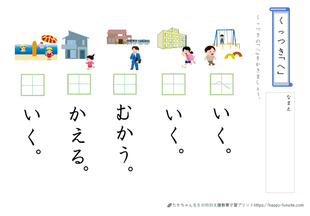 ひらがなの読み書きが苦手なお子さんでも、まずはこのような「視覚的に理解しやすいプリント」から取り組むことで、負担を感じずに助詞の学習を進めることができます。