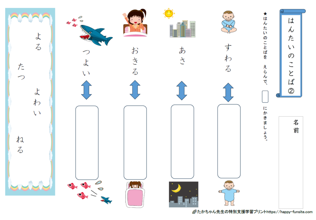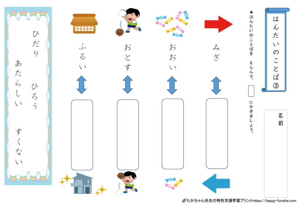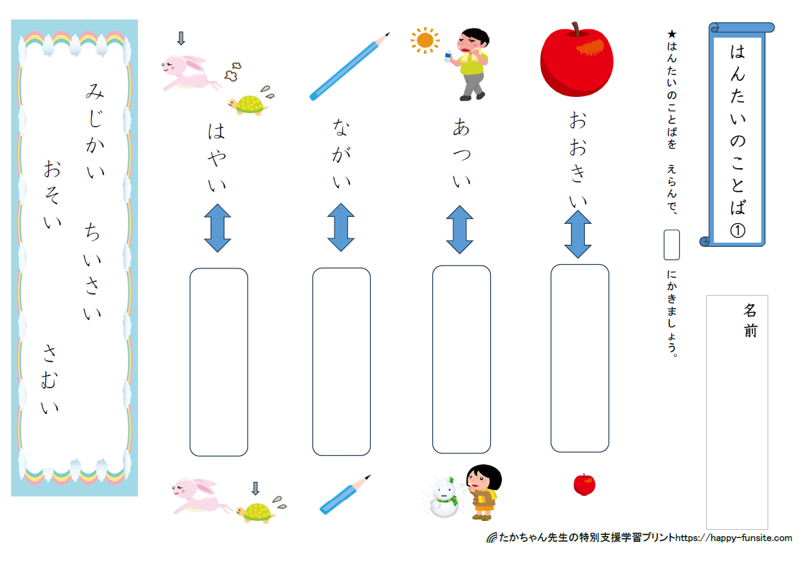 言葉の学習 特別支援プリント「はんたいのことば」です。