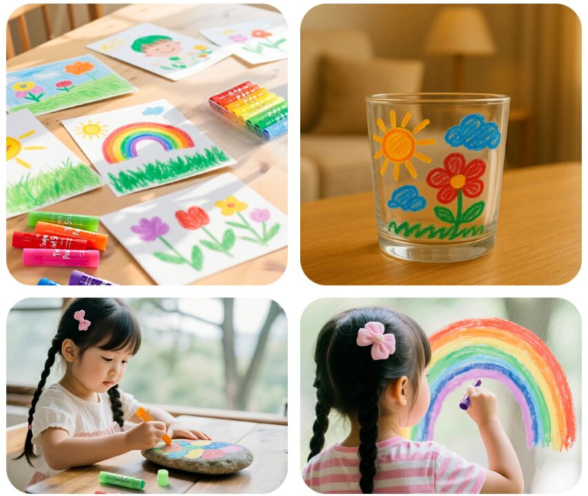 もちろん普通のクレヨンみたいに紙に描くこともできます。普通のクレヨン以上に発色がキレイで小さなアートのようになるので驚きますよ。