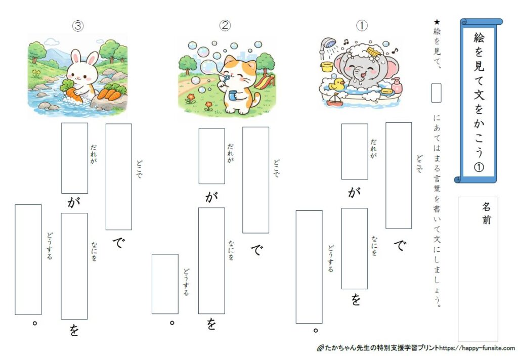 イラストが視覚的にわかりやすく、「どこで」「だれが」「なにを」「どうする」の穴埋め形式で考えるので、文章を書くハードルをぐっと下げることができます。