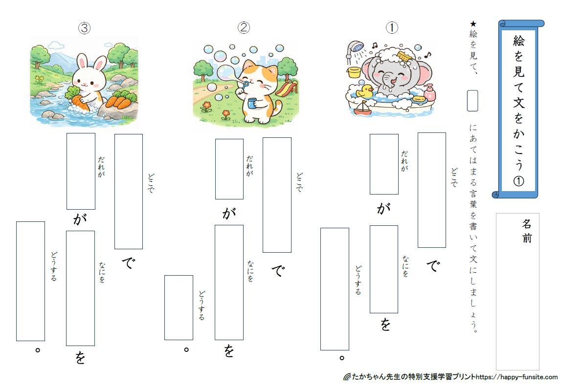 文作りの特別支援むけプリント|絵を見てあなうめ文作り①