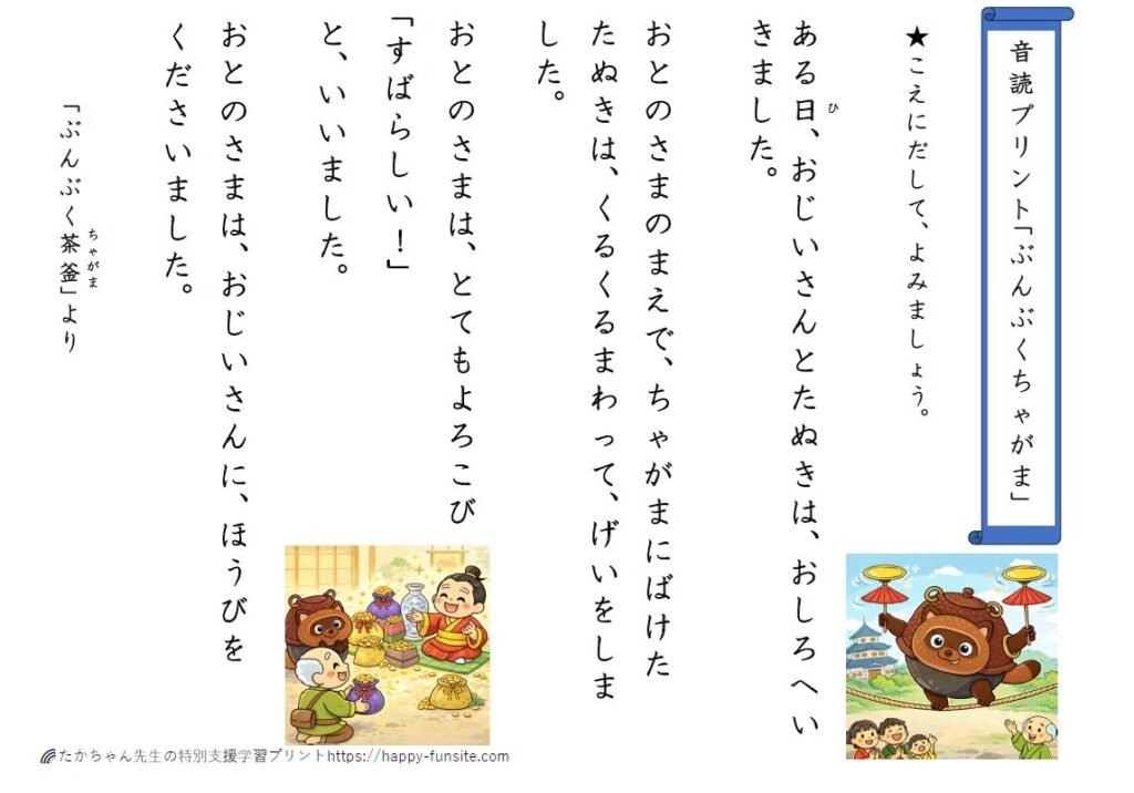 特別支援むけ音読プリント「ぶんぶく茶釜」