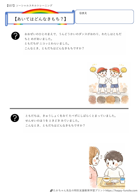 今回は、授業・休み時間・給食・行事など、学校でよくある場面をもとに、「こんなとき相手はどんな気持ち?」と考える練習ができる内容です。