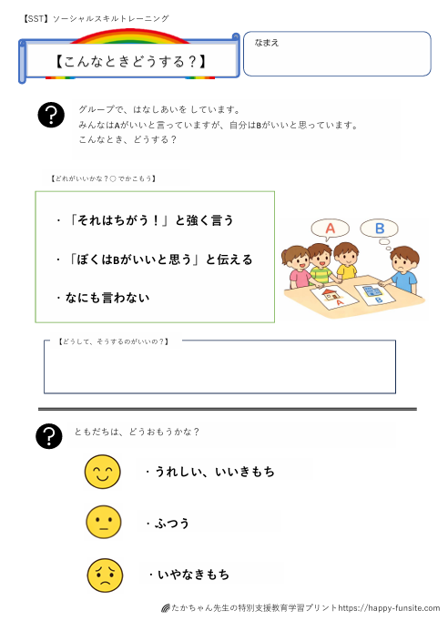 こんなときどうする?SSTプリント①「自分だけ意見がちがうとき」